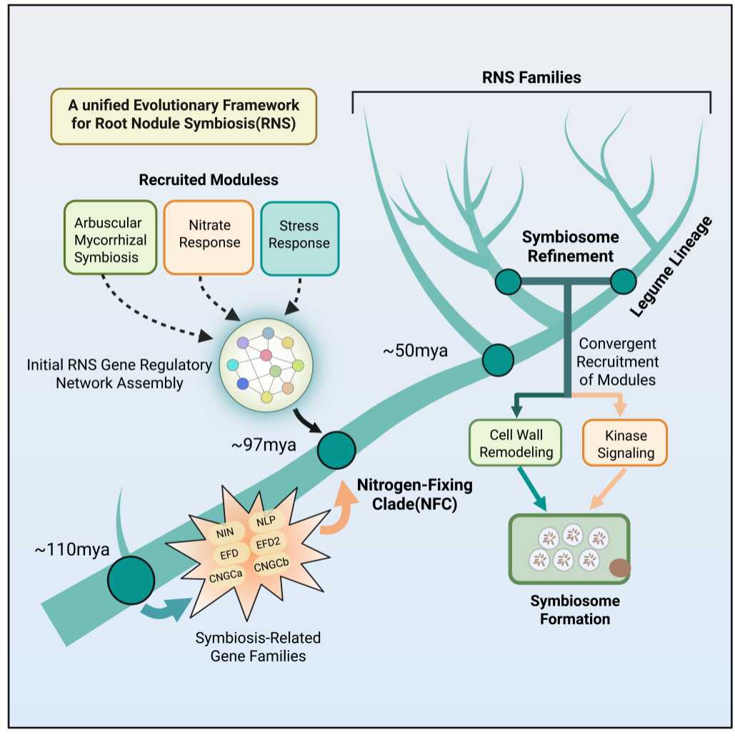 中国科学院昆明植物研究所伊廷双研究员和李德铢研究员团队与分子植物卓越创新中心王二涛研究员团队合作,依托国家重大科技基础设施“中国西南野生生物种质资源库”,在前期对被子植物尺度、共生固氮支系和豆科植物尺度系统发育研究的基础上,对根瘤共生基因调控网络的形成和演化机制展开展了深入研究。通过对10个关键固氮支系代表物种的全基因组测序,结合已发表的194个基因组开展比较基因组与系统发育分析,实现了固氮分支所有10个科及豆科所有6亚科的全基因组覆盖,首次在单基因水平解析了根瘤共生基因调控网络的演化架构。研究的关键突破在于揭示了三次“基因革新”造就了结瘤共生固氮能力:首先,核心真双子叶植物的伽马(γ)古六倍化事件产生了大量重复基因,为结瘤诱导基因和固氮关键基因(如NIN、CNGCa、NFP)的后续功能分化与转化提供了遗传物质基础;此后,通过三条原有通路的“跨界整合”建立初步共生结瘤固氮基因调控网络(GRN-RNS)。根瘤共生固氮分支的共同祖先通过模块化方式招募并重构了线丛枝菌根共生、硝酸盐响应及胁迫响应通路基因,形成初始的GRN-RNS; 最后,豆科植物通过趋同演化形成高效根瘤共生体。在豆科植物中,这套初始网络被进一步优化,通过趋同演化招募了细胞壁重塑和激酶信号模块,最终形成高效、稳定的“共生体”结构。研究发现,两个关键基因NPL和SymSTK起到了决定性作用。