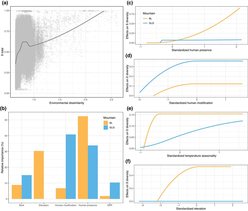 图1广义相异模型对中国西南部受保护的高黎贡山和未受保护的碧罗雪山的山地森林中大中型哺乳动物红外相机监测存在和缺失数据的分析结果:(a)总功能β多样性与环境相异性(人类压力、人类改造、净初级生产力 (NPP)、温度季节性 (Bio4) 和海拔)之间的关系;(b)每个预测因子对总功能β多样性的相对贡献 (使用百分比解释偏差);(c-f)部分生态距离图,显示了每个变量对受保护 (蓝色) 和未受保护 (黄色) 位点总功能β多样性的独立影响 (曲线形状表明功能特征空间的变化速率如何沿每个环境梯度变化)。