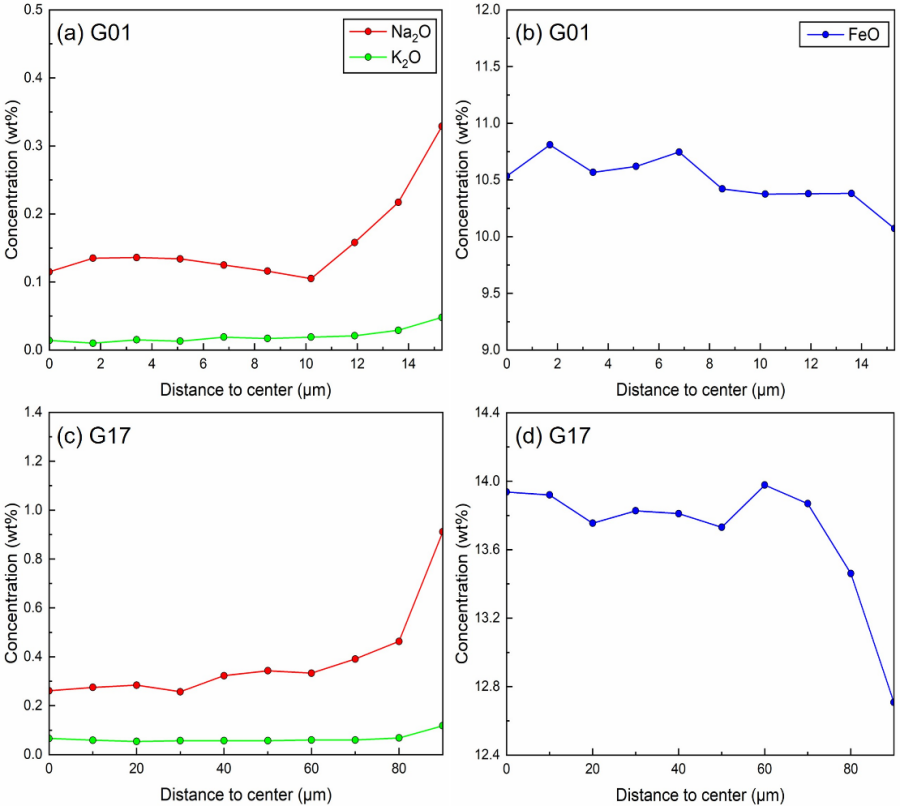 图2 G01和G17撞击玻璃珠中Na2O、K2O和FeO沿径向剖面的代表性成分变化
