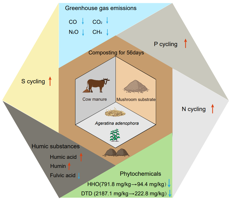 中国科学院昆明植物研究所大型真菌种质资源与绿色发展专题组持续开展农林废弃物资源化利用底层关键技术和科学问题研究,系统解析了生物质转化过程中微生物互作、毒性消减与养分调控的核心规律,在堆肥发酵、清洁转化、高值利用等方面已形成较好技术积累。紫茎泽兰(Ageratina adenophora)是我国首批公布的重点管理外来入侵物种,素有“生态杀手”之称,其释放的有毒倍半萜类物质严重破坏本土生态、阻碍农牧生产,有研究提到紫茎泽兰对畜牧业和草地生态系统的综合损失约36.2亿元人民币/年,传统处置方式易造成二次污染且难以资源化利用。团队立足既有研究基础,围绕紫茎泽兰无害化处置与高值化利用取得系列进展,构建“堆肥预脱毒—黑水虻深度转化”双相生物转化体系,通过二次脱毒、多重提质,成功将其转化为优质生物肥,为入侵植物综合治理与循环利用提供新可能。