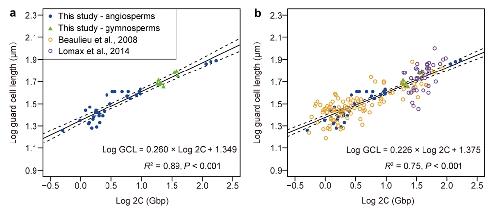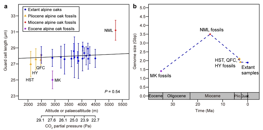 中国科学院西双版纳热带植物园(简称“版纳植物园”)古生态研究组和生物地理与生态学研究组团队通过对西藏芒康(晚始新世,~34.6 Ma)、南木林(中中新世,~15 Ma)以及云南浑水塘、庆福村、鹤庆红园(晚上新世,3.6–2.58 Ma)共5个植物群(图1)中采集的壳斗科栎属高山栎组(Quercus sect. Heterobalanus)化石角质层进行分析,发现西藏南木林的高山栎组化石气孔尺寸显著大于其它地区的化石及其最近现生亲缘种的气孔(图2a)。由于植物气孔大小与基因组大小呈显著正相关,叶化石的气孔大小可作为估测古基因组大小的有效替代指标。该研究基于42种种子植物和已发表的139种被子植物的气孔大小与基因组大小,完善了二者之间的正相关关系曲线(图3),进而利用上述5个植物群的高山栎组化石气孔大小估算其古基因组大小。结果显示,西藏南木林化石的基因组大小远高于西藏芒康和云南上新世3个植物群的化石以及现生高山栎组植物(二倍体)的基因组大小(图2b),其比值落在四倍体与二倍体基因组大小比率的范围内。据此推测,高山栎组植物在晚始新世时期为二倍体,在中中新世时期可能发生了古多倍化事件成为四倍体,然而该四倍体很可能随后灭绝,导致从晚上新世至今只存在二倍体。